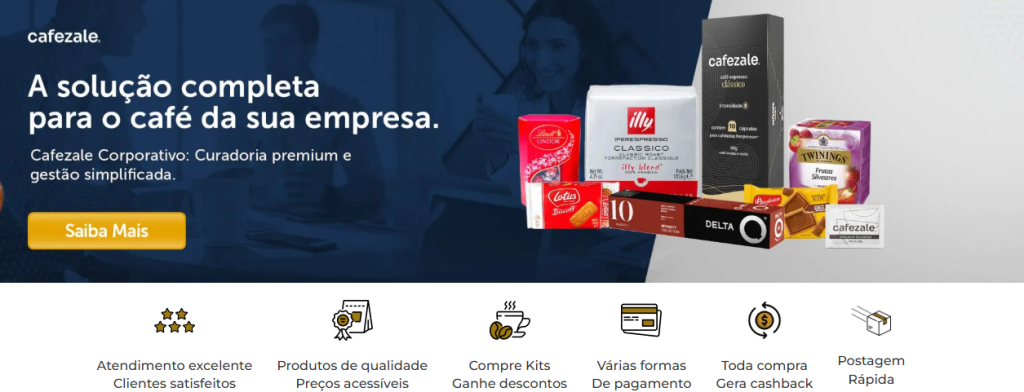 Um exemplo prático vem do cliente Cafezale, atendido pela nossa agência. Ao acessar o e-commerce da marca, é possível ver esse conceito em ação: cashback em todas as compras, frete grátis em algumas regiões do Brasil e seções de recomendação personalizadas para o cliente.